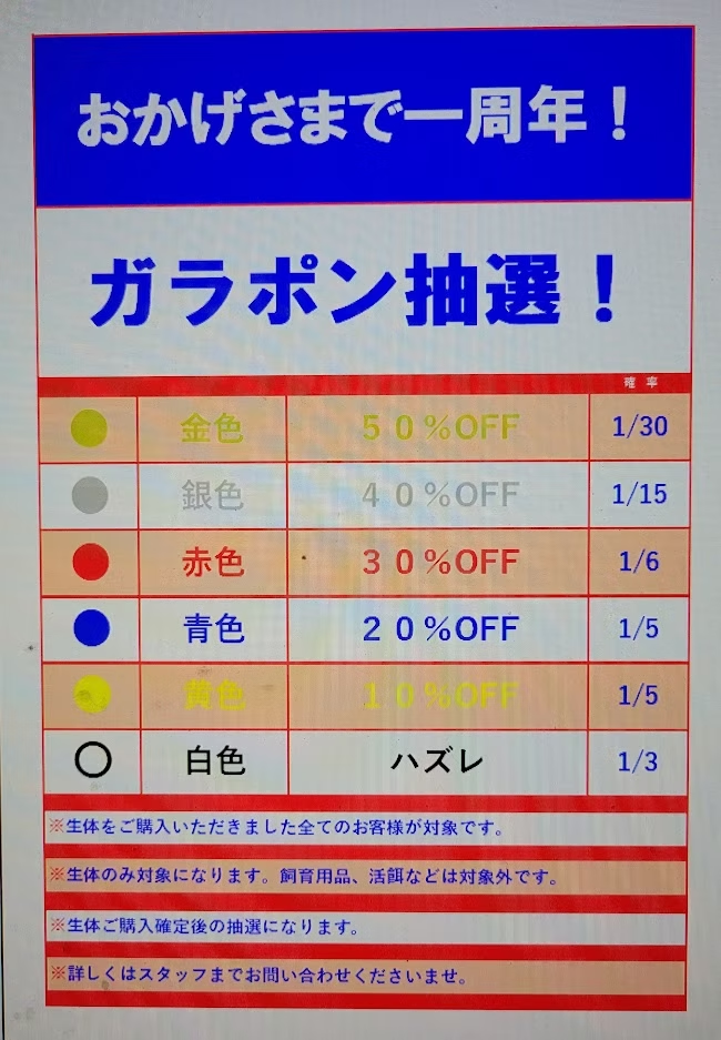 ご奉仕価格の生体はガラポン抽選の対象外になりますのでよろしくお願いします。